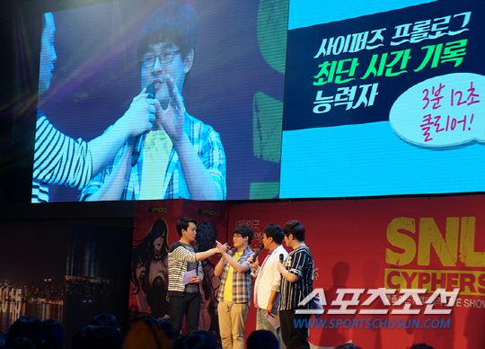 왼쪽부터 단호한 K, 방송인 허준, BJ 불멸. 행사 내내 위트있는 진행으로 유저들에게 웃음을 줬다. 아래는 탄야를 선물로 달라고 하는 허준.