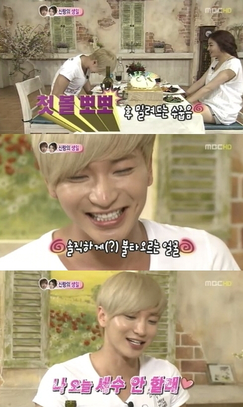 강소라 뽀뽀 선물을 받은 이특은 "갑자기 더워진다. 나 오늘 세수 안 해야겠다. 혹시 거울 가지고 있냐. 뽀뽀받은 쪽 뺨을 직접 보고 싶다"고 말해 웃음을 자아냈다.