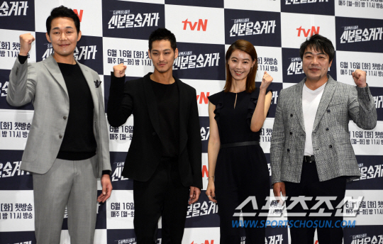tvN 새 월화드라마 '신분을 숨겨라'(극본 강현성, 연출 김정민)의 제작발표회가 3일 서울 여의도CGV에서 열렸다. 박성웅 김범 윤소이 이원종이 포즈를 취하고 있다. 오는 16일 첫 방송되는 tvN 새 월화드라마 '신분을 숨겨라'는 경찰청 본청 내 극비 특수 수사팀 '수사 5과'의 범죄 소탕 이야기를 그린 도심액션 스릴러로 탄탄한 스토리라인, 속도감 있는 전개, 긴장감 넘치는 도심액션을 담아 올 여름 무더위를 시원하게 날릴 것으로 방송 전부터 기대를 높이고 있다. 여의도=허상욱 기자 wook@sportschosun.com