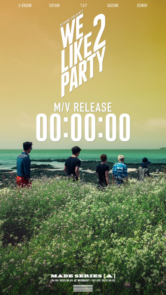 YG는 그 동안 'WE LIKE 2 PARTY' 티저 포스터를 공개하며 강렬한 느낌의 'BANG BANG BANG' 과는 대비되는 청량한 블루 이미지를 선보였다. 이에 'WE LIKE 2 PARTY' 뮤직비디오는 또 어떤 새로운 분위기로 빅뱅만의 매력을 보여줄 지 기대를 모으고 있다.