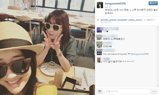 강예원은 지난 달 22일 자신의 인스타그램에 "현숙언니 미국 가기 전에. 너무 반가웠구 조만간 놀러갈게요"라는 글과 함께 윤현숙과 함께 찍은 사진을 공개했다.