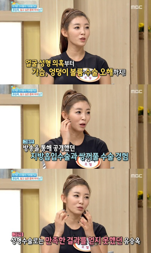 이날 유승옥은 "턱 깎았다는 오해, 코와 가슴을 수술했다는 오해도 받았고, 엉덩이에 뽕을 넣었다는 루머도 있었다. 억울하다"고 토로했다.