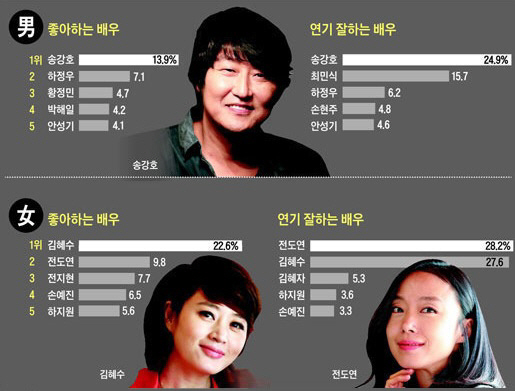 여배우 설문조사에서는 한국영화를 이끌어가는 투톱 김혜수와 전도연이 장군멍군을 불렀다. '대체불가 여배우' 김혜수는 '좋아하는 배우'에서 22.6%의 압도적인 표를 얻어 2위 전도연(9.8%)을 앞질렀다. 전지현 손예진 하지원이 뒤를 이었다. 반면, '연기 잘하는 배우'를 묻는 조사에서는 '칸의 여왕' 전도연이 28.2%의 지지로 김혜수(27.6%)를 간발의 차로 제치고 1위에 올랐다. 김혜자 하지원 손예진이 뒤를 이었다. 김혜수와 전도연은 최근 '차이나타운'과 '무뢰한'을 통해 마성의 연기력을 선보이며 충무로 최고 여배우로서의 입지를 재확인했다.