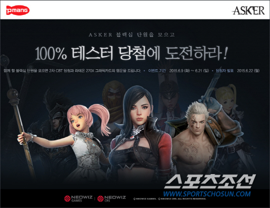 '애스커'는 테스트 신청을 완료한 이용자 전원에게 최고급 PC, 그래픽카드, 문화상품권 등을 획득할 수 있는 미스터리 상자를 선물한다. 또 SNS를 통해 함께 테스트에 참여할 친구를 모으면 그래픽카드 등 경품에 응모할 수 있으며, '애스커'의 웹소설을 공유한 이용자에게는 문화상품권을 선물한다. 남정석 기자 bluesky@sportschosun.com