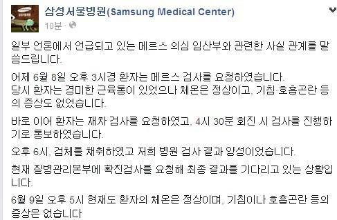 삼성서울병원은 9일 오후 공식 페이스북 계정을 통해 "일부 언론에서 언급되고 있는 메르스 의심 임산부와 관련한 사실 관계를 말씀드립니다"라는 글을 게재했다.