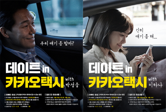 박성웅, 이하나 등과의 택시 데이트 참가자 모집을 알리는 카카오택시 이벤트 포스터가 공개됐다. 포스터에서 박성웅은 "우리 얘기 좀 할까?"라는 글귀와 함께 만남을 기대하는 표정을, 이하나는 "긴히 얘기 좀 해…"라며 설레는 표정으로 누군가에게 연락을 하고 있다.