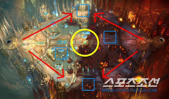 전반적인 게임의 흐름은 중앙 불멸자 중심으로 이어지지만 중앙싸움이 길어지면서 라인에서 손해를 보는 경험치가 상당하기에 불멸자의 공략 포기를 요구하는 순간도 종종 발생한다. 때문에 4인이 불멸자 공략에 힘쓰고 빠르게 한타 싸움에 합류할 수 있는 1인이 경험치를 지속적으로 수급하는 전략도 볼 수 있으며 애초부터 영웅군을 대인전 중심으로 한타 싸움에 올인할 수 있다.