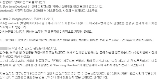 해당 글에는 홍익대학교 법대의 한 전임교수가 최근 기말고사 영어지문으로 "Dae Jung Deadbeat(게으름뱅이 대중)", "owl rock Roh(부엉이 바위 노씨)" 등 가상 인물을 등장시켰는데, 고인이 된 김대중·노무현 두 전직 대통령을 연상케 한다는 내용이 담겼다.