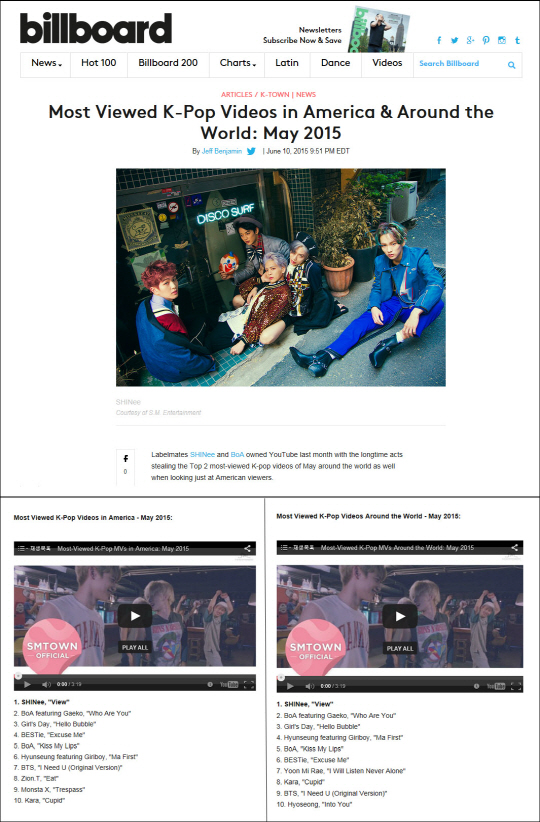 특히, 빌보드는 "샤이니가 약 1년 반 만에 선보인 'View' 뮤직비디오는 2015년 5월 가장 많이 본 K-POP 뮤직비디오에 등극했다. 샤이니는 그들의 유튜브 파워를 이미 지난 1월, 종현의 'Crazy' 뮤직비디오 1위를 통해 증명하기도 했다"고 설명해 눈길을 끈다.