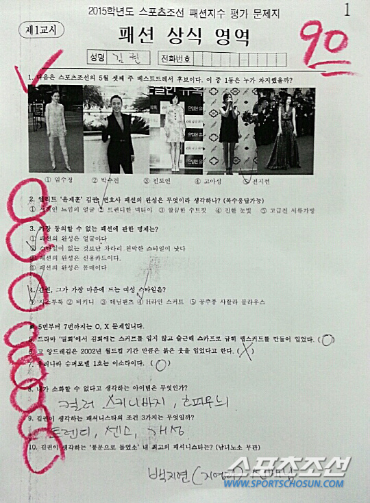 먼저 김권의 패션고사를 공개합니다. 소신 있는 윤 변호사는 막힘 없이 슥슥 풀어나가는 모습이 인상적이었습니다. 점수 또한 우수한 90점! 인상적이었던 문제를 몇 가지 짚어보도록 하겠습니다.