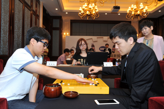 2015박카스배 한중바둑 미래 천원전 1차전에서 신민준 3단(왼쪽)이 강호 커제 9단을 맞아 착점하고 있다. 사진제공=한국기원