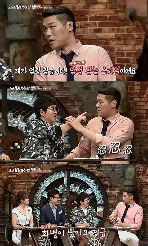 최근 녹화장에서 MC 김성주가 '화병'에 대해 설명하면서 "우리나라에는 화를 밖으로 표출하지 않고 참는 사람들이 많다"고 이야기하자 MC 서장훈이 불쑥 끼어들며 "제가 바로 엄청 참는 스타일"이라고 주장해 이목을 사로잡았다. 이에 MC 정형돈이 서장훈의 귀를 살짝 건드리며 장난을 계속하자 서장훈은 정형돈의 두 팔을 어린아이 다루듯 한 손으로 제압하며 "근데 요즘은 화병이 난다"고 말해 스튜디오를 웃음바다로 만들었다는 후문이다.