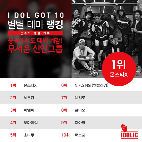 아이돌릭 TV에서 매주 방영중인 신개념 아이돌 랭킹쇼 'IDOL GOT 10' (이하 '아갓텐')에서 몬스타엑스는 '한국을 넘어 중국까지 넘보는 무서운 신인' 1위에 등극하며 다시한번 대형신인임을 입증했다.
