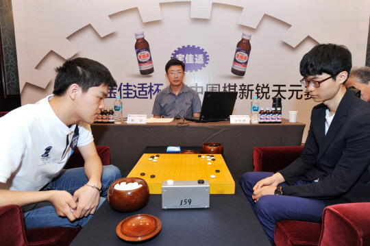 ◇2015박카스배 한중바둑 미래 천원전 2차전에서 한국의 주장으로 나선 이동훈 5단(오른쪽)이 중국의 커제 9단을 맞아 대국을 펼치고 있다. 사진제공=한국기원