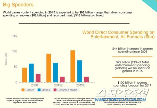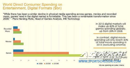 글로벌 시장조사업체 IHS Technology가 2015년 전세계 게임이 영화와 음악을 뛰어넘는 최대 산업이 될 것이라고 예측했다. 2017년에는 1,000억 달러(약 111조 8천억 원)에 도달할 것으로 내다봤다.