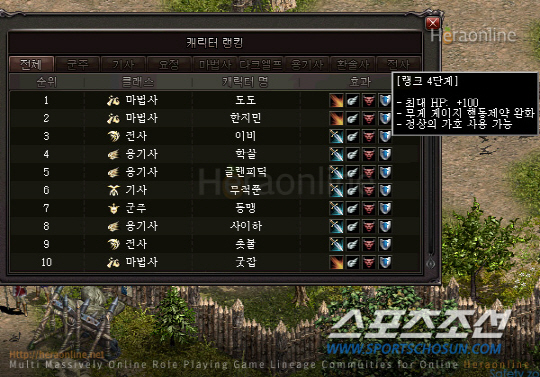 랭커 시스템은 이외에도 캐릭터 선택 화면에서 캐릭터 이미지에 등급 표시가 되며, 아덴월드 입장 시 랭커 정보 제공되며, 채팅 시 캐릭터명 앞에 등급 표시된다. 현재 테스트 서버에서는 랭커 전용 Hero변신은 아직 미구현 상태이며, 채팅 시 캐릭터의 등급과 캐릭터명이 표시되고 있다.