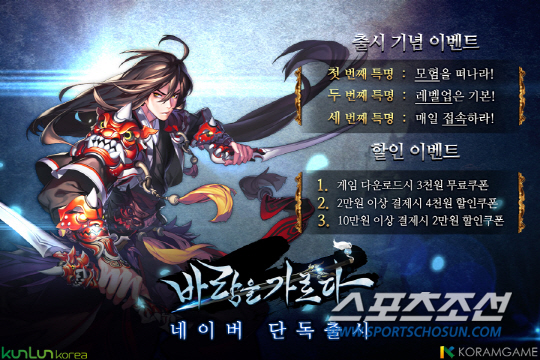 쿤룬코리아는 <바람을 가르다> 네이버 앱스토어 출시를 기념해 인게임과 공식 카페에서 다양한 이벤트를 19일부터 실시한다. 먼저, 네이버 앱스토어를 통해 게임을 다운로드하는 모든 게이머에게 네이버 앱스토어 3천원 무료 쿠폰을 제공하고, 결제 금액에 따라 차등적으로 사용 가능한 할인 쿠폰을 지급한다.