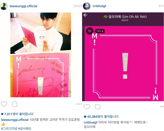 공개된 사진 속 이승기는 마마무의 사인CD를 유심히 바라보며 인자한 미소를 지어보였다. 사인CD 속에는 '너무 멋지신 승기 선배님'이라는 마마무의 애교 섞인 메시지가 눈길을 끈다.
