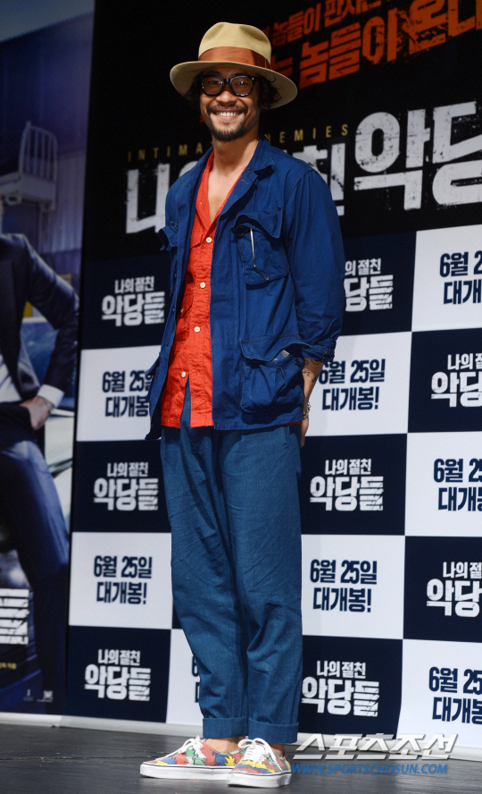 영화 '나의 절친 악당들'의 제작발표회에 등장한 그는 옅은 베이지 컬러의 색감이 돋보이는 페도라를 활용한 룩을 선보였습니다. 높이 솟은 기둥과 더 짙은 브라운컬러의 띠가 포인트입니다. 여기에 다소 거친 느낌이지만 자연스럽게 자란 수염과 안경으로 보헤미안 감성을 제대로 어필했네요. 내추럴한 소재감이 돋보이는 블루 재킷과 팬츠에 오렌지컬러 셔츠를 매치하여 감각적인 배색 룩을 완성했습니다.
