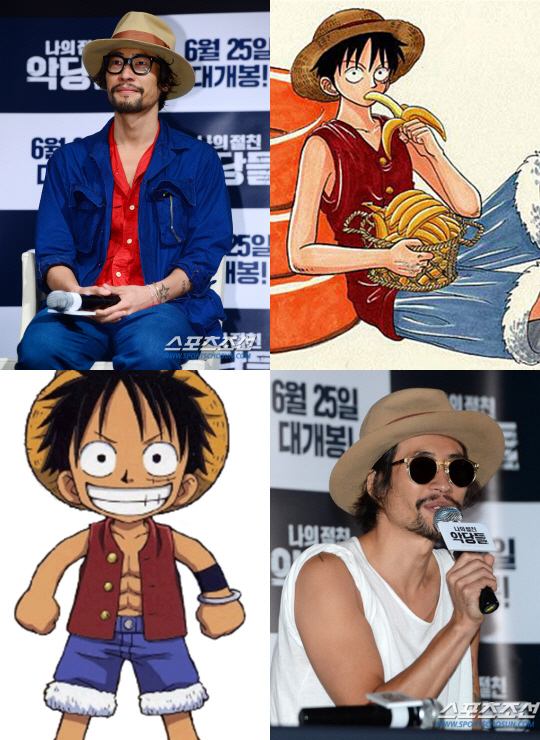 페도라를 활용한 그의 두 행사의 룩, 어디서 많이 본 듯한 느낌이 들지 않으신가요? 바로 일본 애니메이션 '원피스'의 주인공 루피를 그대로 닮았습니다. 브라운 계열의 페도라와 마구잡이로 자란 느낌의 블랙컬러 헤어스타일, 레드&블루 계열의 자연스런 실루엣의 의상을 활용한 점이 비슷하네요. 파리에 거주하는 동안 애니메이션 작품들을 즐겨 봤나 봅니다.