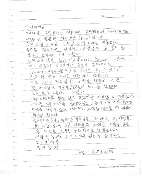 이어 "저는 노래가 하고 싶어서 노래를 하였고, 더 큰 꿈, 하고 싶은 가수가 되고 싶어 노래를 했습니다. 노래를 하고 싶다, 하겠다 라는 마음으로 힘든 날도 있었지만 이겨낼 수 있었습니다"라며 "일베가수 브로, 일베충 가수 브로가 아닌 저 박영훈 한사람으로서 팬 여러분과 노래로 마음을 공유할 수 있는 진정한 노래쟁이로 살겠습니다"라고 밝혔다.