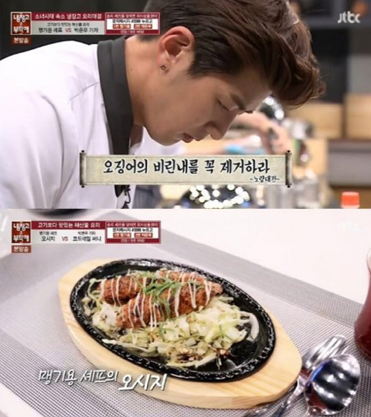 앞서 22일 방송에서 소녀시대 써니의 냉장고를 두고 박준우와 맹기용이 '고기보다 맛있는 해산물 요리' 대결을 벌인 가운데, 맹기용은 오징어를 소시지 형태로 만든 '오시지'를 선보였다.