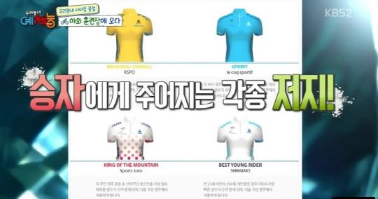 그런가하면, 라이더들이 영광스럽게 생각하는 특별한 저지도 있다. 세계 최고 권위의 사이클 대회, 뚜르 드 프랑스에서 선수들 중에서도 최고만이 입을 수 있는 챔피언 유니폼이 바로 그것이다. 이를 본따 아시아 최대 규모 사이클 대회인 뚜르 드 코리아에서도 승리한 선수들에게 리더 저지를 입히는데, 총 4종류다. 먼저 베스트 영 라이더 부문 승자(만 23세 미만 참가 선수 중 누적 경기 기록이 가장 빠른 선수)는 화이트 저지를 입는 영광을 누린다. 스프린트 부문 승자는 블루 저지를 입는다. 라이더의 진을 빼놓는 업힐 산악구간 경쟁에서 승리한 킹 오브 마운틴 저지는 흰 바탕에 붉은 반점이 수놓아진 가장 화려한 옷으로도 유명하다. 이외에도 개인종합 우승자에게는 옐로우 저지가 주어진다.