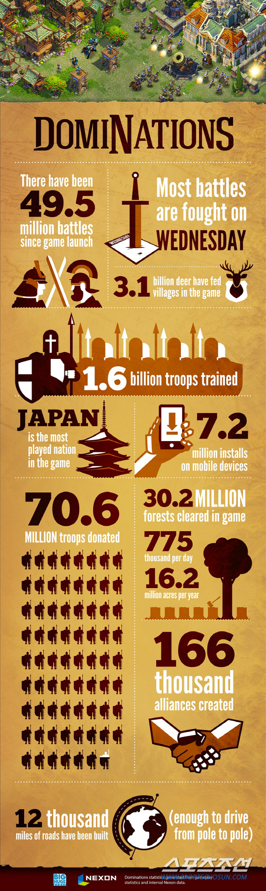 넥슨M은 지난 4월 3일 출시된 모바일게임 도미네이션즈가 2개월 만에 720만 다운로드를 기록했고, 이를 기념해 게임과 관련된 다양한 데이터를 인포그래픽 형태로 공개했다.