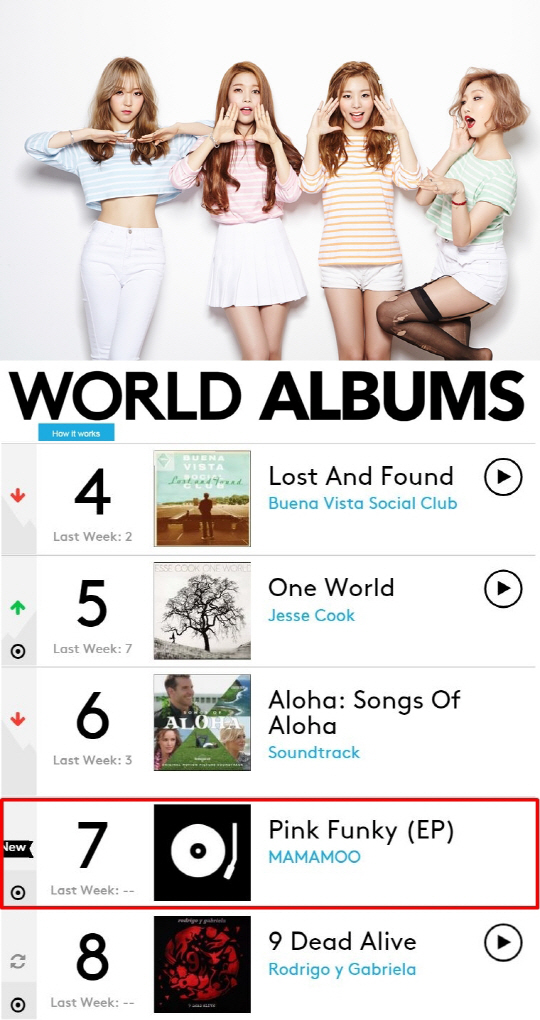 26일 오전 업데이트된 빌보드 월드앨범차트에 따르면 마마무의 두 번째 미니앨범 '핑크 펑키(Pink Funky)'는 7위를 차지하며 빌보드의 기대에 부응했다.