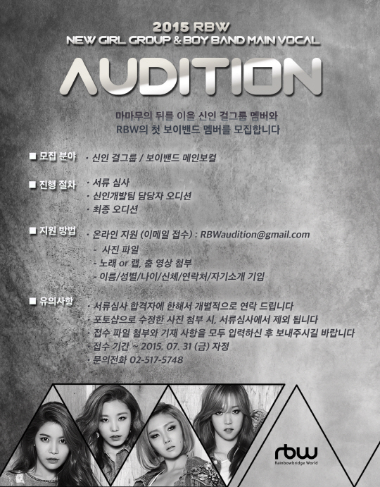 이번에 진행될 'RBW's New Girl Group & Boy Band Main Vocal Audition' 에서는 마마무의 계보를 이을 신인 걸그룹 멤버와 RBW의 첫 보이밴드 멤버를 모집중이다. 오디션 접수는 7월 31일까지 가능하며, 나이 제한 없이 스타를 꿈꾸는 사람이라면 누구나 지원 가능하다.