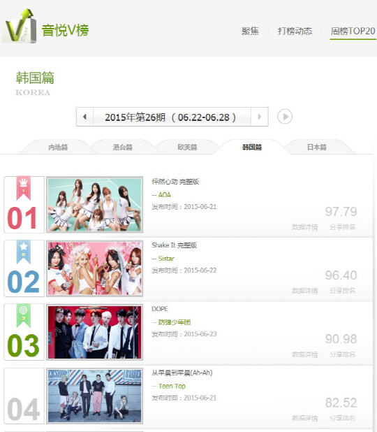 걸그룹 AOA(지민 초아 유나 혜정 민아 설현 찬미)가 중국 최대 음악사이트 인위에타이 주간차트에서 1위를 차지했다.