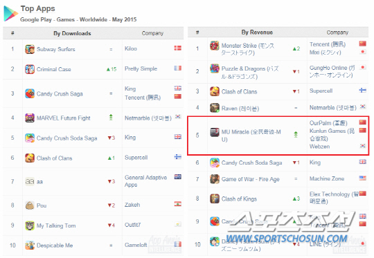 웹젠(대표 김태영)의 모바일게임 뮤 오리진이 구글 플레이스토어 'World-wide' 매출 순위 5위에 올랐다.
