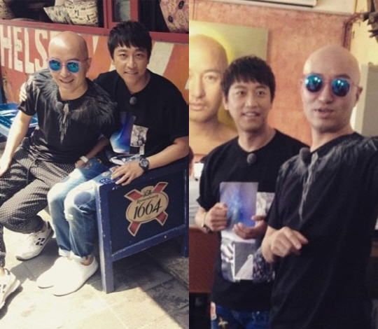 공개된 사진에는 '현장토크쇼-택시'의 MC 오만석과 함께 자신의 가게 앞에서 다정하게 앉아 있는 홍석천의 모습이 담겨있다.
