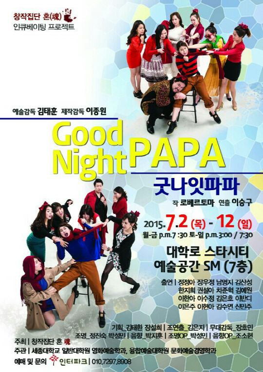 세종대학교 창작집단 혼 인큐베이팅 프로젝트 연극 'GOOD NIGHT PAPA'는 1950년대 프랑스 한 교외에 위치한 부르주아 대저택에서 일어난 사건을 기초로 한 블랙 코미디. 크리스마스를 맞아 대가족이 모인 어느날 아침, 침대 위에서 등에 칼이 꽂힌 채 죽은 아버지가 발견된다. 눈이 오는 고립된 저택, 여덟명의 용의자. 아버지를 둘러싸고 여덟명의 여인들이 미스터리로 가득찬 하루를 보내는 이야기다.