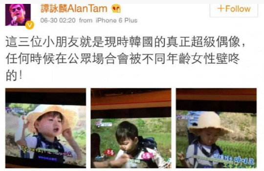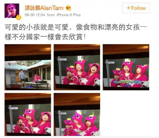 중화권 스타 알란탐이 한국 배우 송일국의 삼둥이의 열혈팬임을 인증했다.