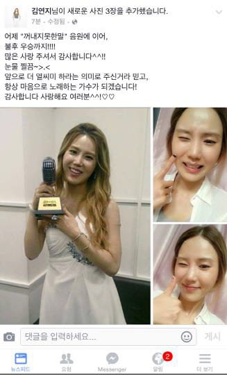 김연지는 4일 밤 자신의 트위터와 페이스북 등지에 "3일 '꺼내지 못한 말' 음원에 이어 불후 우승까지! 많은 사랑 주셔서 감사합니다. ^^. 눈물 찔끔"이라고 가슴 벅찬 소감을 밝혔다.