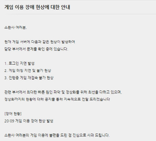 공지에 따르면 오후 8시 9분 게임 이용 장애가 발생해 로그인 지연 발생, 게임 매칭 지연 및 불가 현상, 진행 중 게임 재접속 불가 현상이 나타났다.
