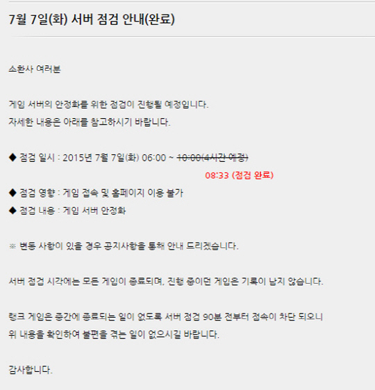 인기 온라인 게임 리그오브레전드(이하 롤)가 서버 점검이 조기 완료됐다.