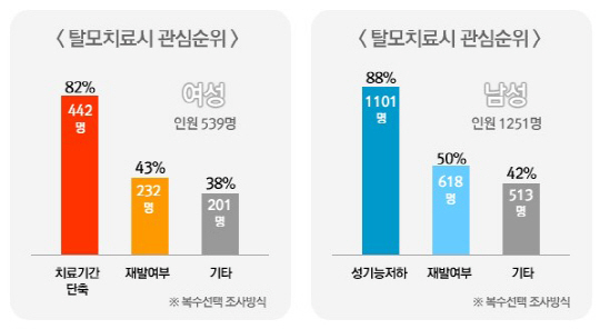 여성은 539명 중 82%인 442명이 치료기간 단축 가능성을 질문했고, 재발여부는 43%인 232명이 궁금해 했다. 이에 비해 남성 1251명 중 88%인 1101명이 발기부전이나 성 능력 약화에 대한 우려를 나타냈다. 특히 20세 미만 16명을 제외하면 모발치료와 성 능력과의 관계에 대해 90% 가까이 관심을 보였다. 또 재발 여부는 남(618명), 여(232명) 모두 50% 정도가 궁금해 했다. 보험적용 여부 문의는 남녀 공히 열 명에 한 명 꼴이었다. 탈모 치료에서 남성은 성 능력 약화를 걱정하고, 여성은 시간을 많이 할애하는 것을 우려한 특징이 있다.