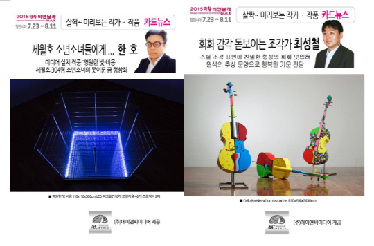 (주)에이앤씨미디어(www.ancmedia.co.kr)가 미술계 최초로 이달 초 제작해 배포 중인 이 카드 뉴스는 전시 제목과 장소, 일정, 한 줄의 작품 주제와 두 줄의 부제만을 상단에 배치하고 시각적인 미술작품과 작가 사진 위주로 한 것이 특징. 또 휴대폰에서 좌우로 작품을 넘길 수 있도록 배치하되 에러가 나지 않도록 표지 포함 12장으로 1차 자료를 만든 것이 특징이다. 또 짧은 주소를 만들어 페이스북과 카톡, 밴드 등으로 손쉽게 건넬 수 있도록 제작했다.