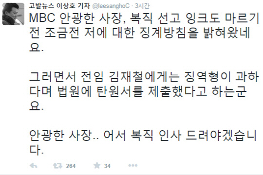 9일 승소 소식이 알려진 후 이 기자는 자신의 SNS에 "MBC 안광한 사장, 복직 선고 잉크도 마르기전 조금 전 나에 대한 징계방침을 밝혀왔다"면서 "전임 김재철에게는 징역형이 과하다며 법원에 탄원서를 제출했다고 한다. 어서 복직 인사 드려야겠다"는 글을 남겼다.