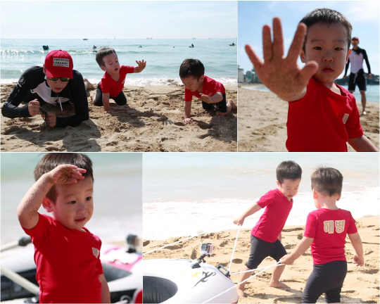 최근 진행된 KBS2 '슈퍼맨이 돌아왔다' 녹화는 '시간이 주는 선물'이란 부제로 꾸며졌다. 부산 사나이 여행을 떠난 서언 서준, 이휘재 부자는 여행 마지막 날을 맞아 해수욕장을 찾았다. 이날 서언-서준은 해병의 상징인 빨간 티셔츠를 입고 아빠 이휘재에게 해병대 트레이닝을 받았다. 이 과정에서 서준은 아빠의 PT체조를 남다르게 해석, 팔다리가 따로노는 허우적PT체조를 선보여 웃음을 안겼다. 서언은 올챙이배를 홀쭉하게 만들며 남다른 복근 운동을 선보였다. 또 서언-서준은 실제 해병대 트레이닝을 방불케 할 정도로 낮은 포복 자세부터 고무보트 끌기까지 도전하며 해수욕장을 점령했다. 그러나 차가운 바닷물에 깜짝 놀라며 전광석화 같은 스피드로 모래사장을 탈출하기도 해 웃음 폭탄을 투하했다는 후문. 방송은 12일 오후 4시 50분.