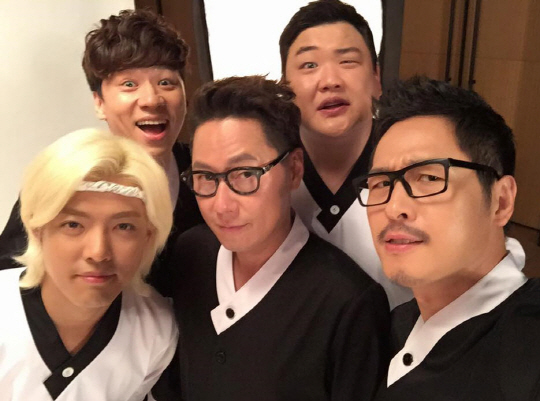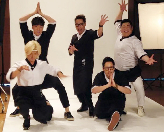 김풍이 공개한 사진에는 '푸드송 가수' 윤종신, '먹방지존 개그맨' 김준현, '양꼬치엔 칭따오' 정상훈, 가수 강남, 그리고 '언더그라운드 요리계'에서 활약하는 본인까지, MC로 발탁된 5명이 단체샷을 촬영하는 모습이 담겨있다.