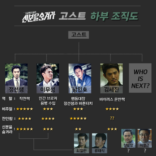 13일 tvN '신분을 숨겨라(이하 신숨)' 제작진은 드라마의 숨은 인기공신인 역대 악역들을 한눈에 살펴보는 '고스트 조직도'를 공개해 이목을 집중시킨다.