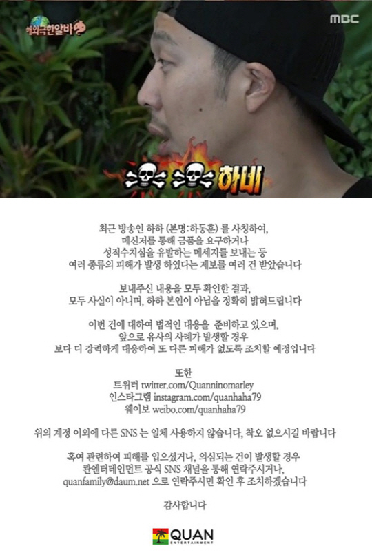 13일 하하는 자신의 트위터에 "좀 착한 마음으로 삽시다. 피해당한 많은 분들께 나쁜 놈들 대신해 사과드립니다. 참고로 카카오스토리도 안 해요"라는 글과 함께 소속사인 콴엔테테인먼트의 공식입장을 링크했다.