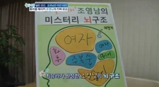 당시 함께 출연한 최유라는 직접 작성한 조영남의 뇌구조를 공개해 시청자들의 눈길을 끌었다.