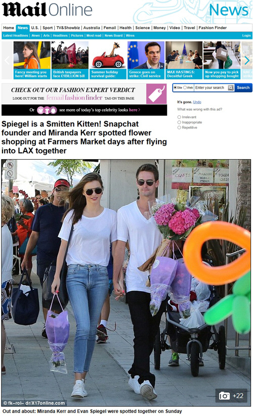 영국 데일리메일은 13일(현지시각) 'X17'의 사진을 인용해 미국 로스앤젤레스의 한 꽃 시장에서 미란다 커와 에반 스피겔이 공개 데이트를 즐겼다고 보도했다.