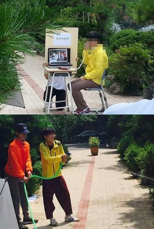 이날 몇몇 학생들은 의자에 앉아 전화를 받는 모습, 급수 호스를 들고 물을 뿌리는 모습을 재현해 눈길을 끌었다.