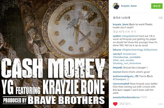 공개된 사진은 " 캐시머니를 뜻 하듯 고가의 명품 시계를 바탕으로 영문으로 Cash Money - YG featuring Krayzie Bone (Produced by Brave Brother)" 라고 쓰여 있다.