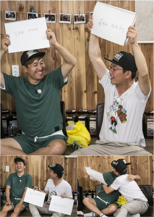 '1박 2일' 김준호-김종민이 복불복 대결 도중 스케치북 사랑 고백으로 활활 타오르는 '바보 브로맨스'를 보여주고 있어 화제다.